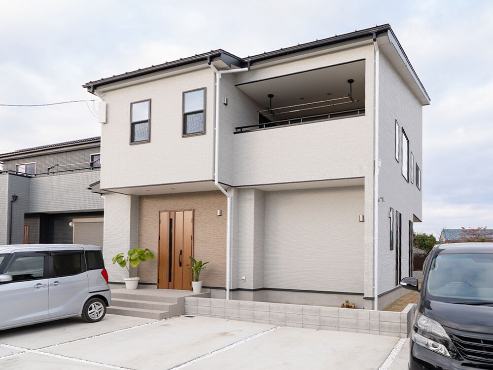 実家の敷地に家を建てることを検討、奥様がタブレットを使ってご自身で理想の図面を作成し店舗に言って相談、玄関部分を広くすることなど一部を修正しただけでほぼ奥様が考えた図面で建てられました。2階リビングにウッドデッキ代わりの7坪のバルコニーが特徴的で天気のいい日はBBQやテーブルセットを置いてゆっくりした時間を楽しむんだり、お子様の遊び場としても使える多目的な空間になっています。